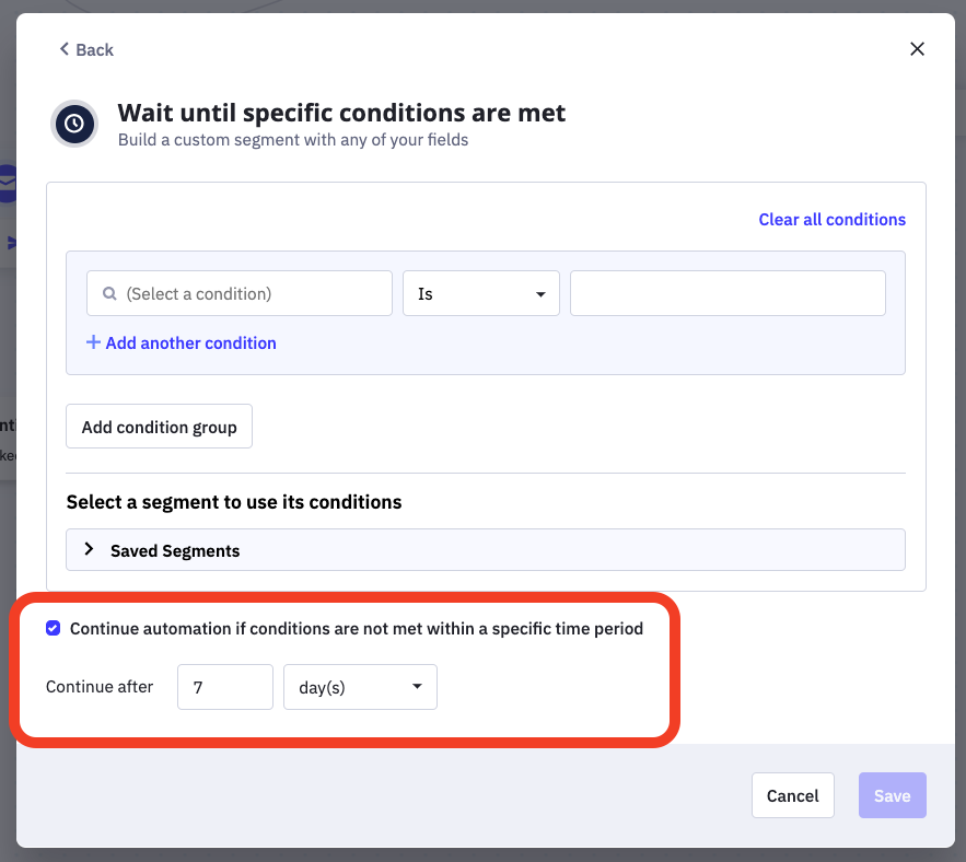 - At the bottom of the modal window you can choose to “Continue automation if conditions are not met within a specific time period.” Once selected you can choose the period of time you’d like the contact to wait before continuing the automation.