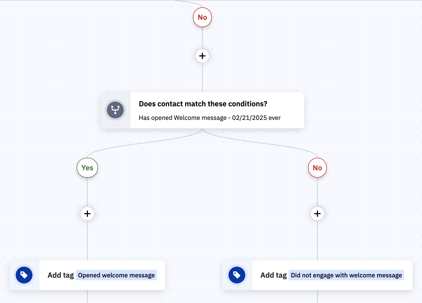 - Under the “Yes” path, add an action to “Add tag” and tag them as “Opened welcome message.”